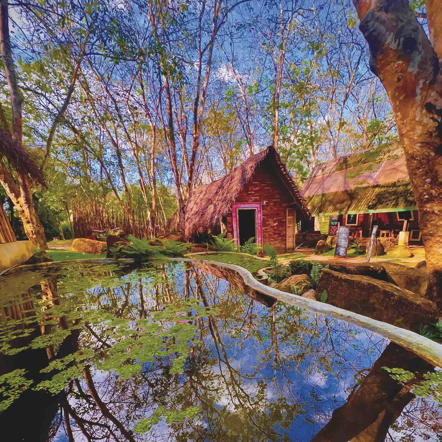 Situated approximately thirty kilometers from Colombo, in Panadura, in the southern district of Kalutara, The Barnhouse has elevated the concept of event venues by fusing the simplistic charm of rustic structures with nature’s rawness. Rather than altering the natural landscape—with its slopes and uneven ground—the structures were integrated into their surroundings, with a stream running through the middle and natural formations enhancing its uniqueness. The property has five chalets and rooms, which management will not expand, so more space remains unbuilt.