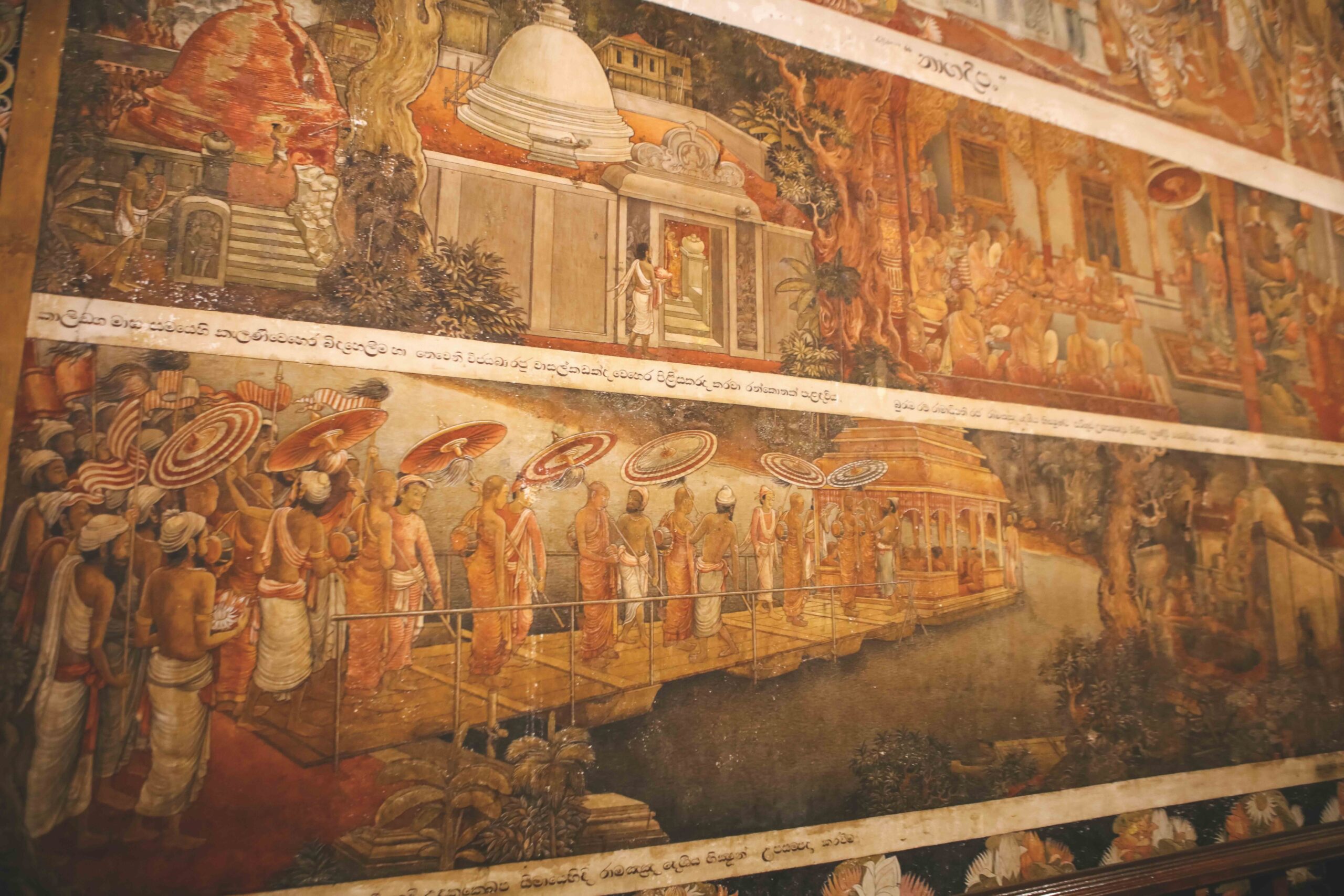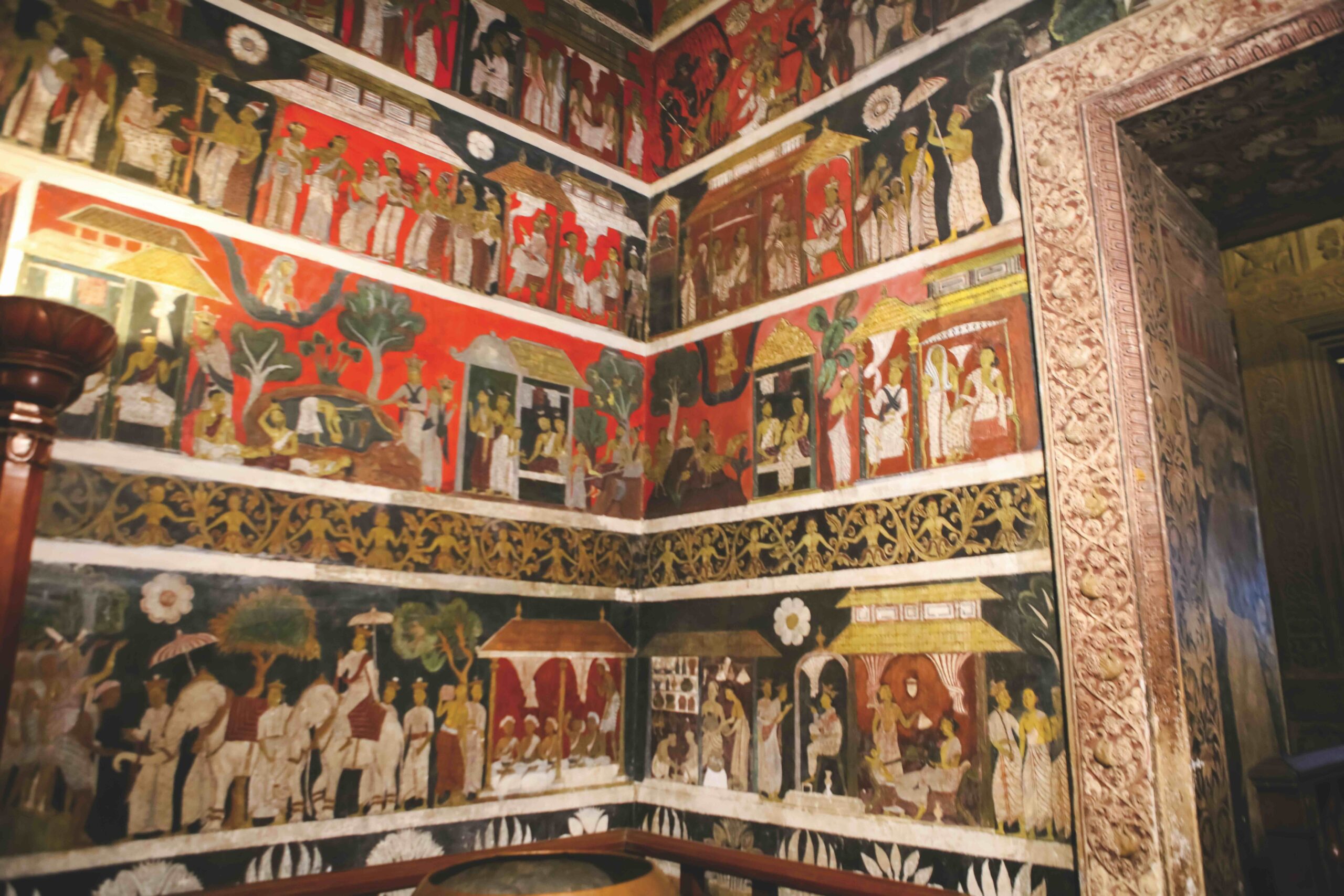 It houses a striking recumbent statue of the Buddha, along with murals depicting six Jataka stories, guardian deities and scenes of everyday life. These paintings are characterized by deep hues of blue, yellow, green, and red that lend them a rich intensity. In contrast, the newer wing features the work of Solias Mendis, whose masterful brushstrokes capture the physical and emotional nuances of human expression. His murals, completed in the 20th century, portray the birth, evolution, and spread of Buddhism in Sri Lanka, including depictions of 12 important Buddhist sites across the island. While Kandyan-era paintings have remained largely intact, Mendis’s work has faced preservation challenges.